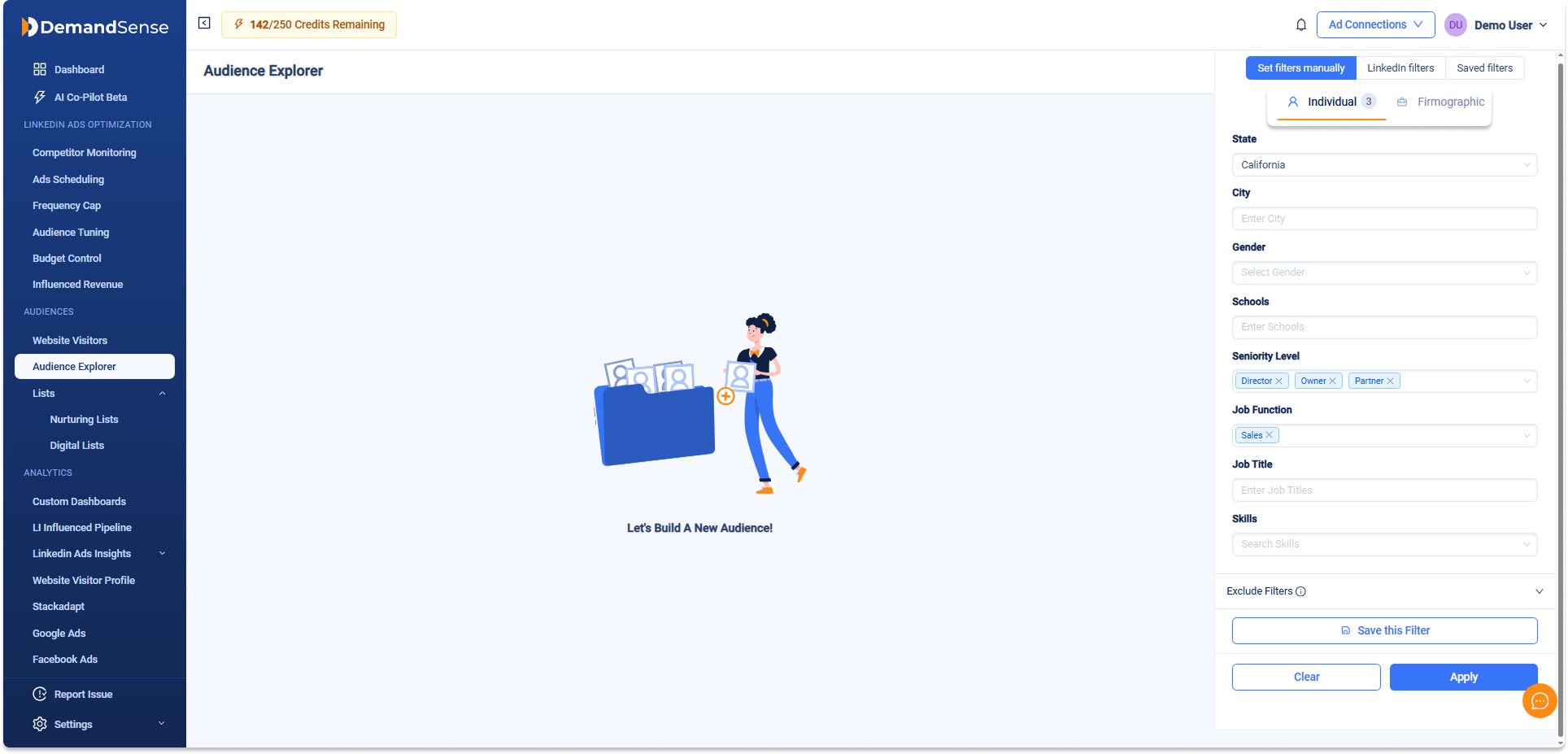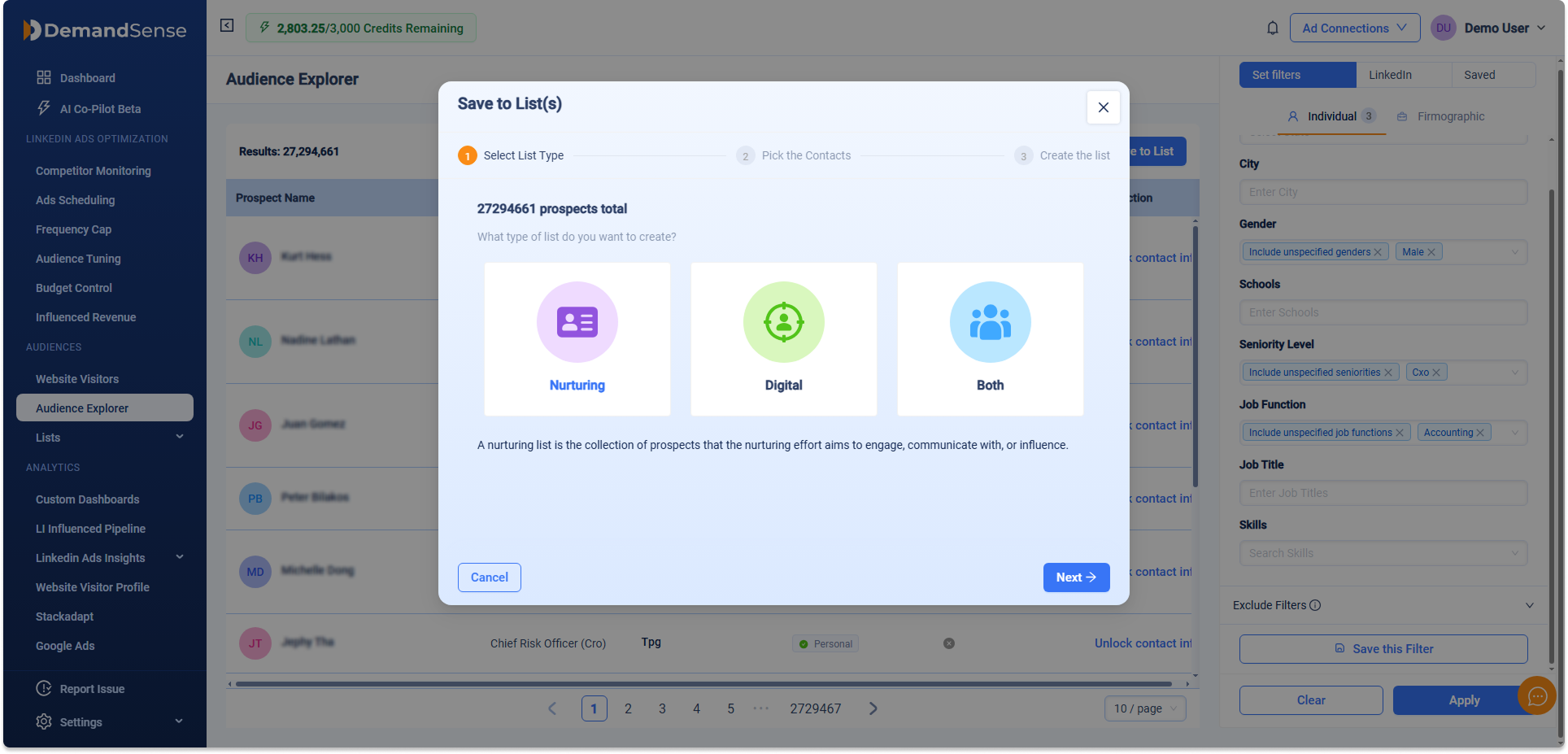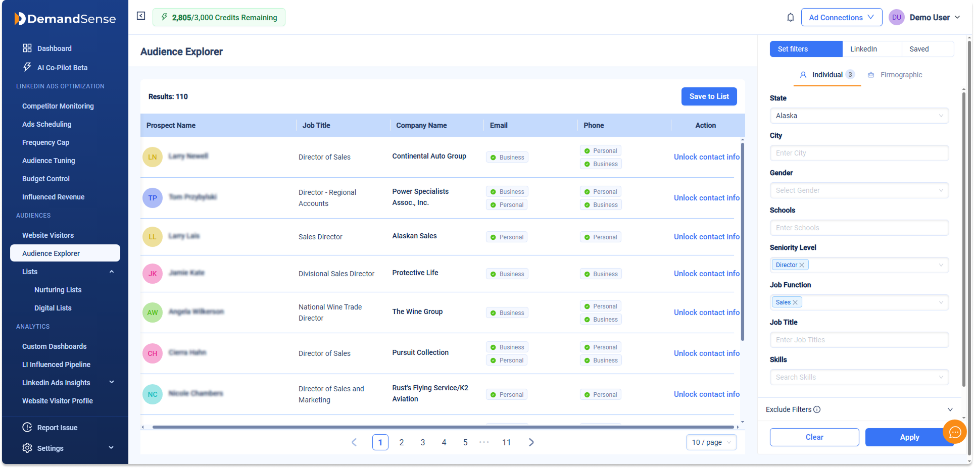 Audience Explorer lets you build precise, targeted lists of B2B prospects quickly and easily. Apply powerful filters to find the right people and companies, preview results, unlock verified contact details (emails and phones), and save prospects to lists ready for nurturing campaigns or digital ads.